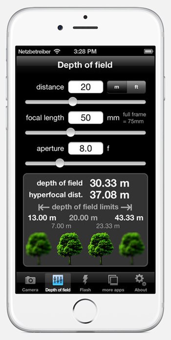 + calculation of depth of field in relation to distance, focal length and aperture